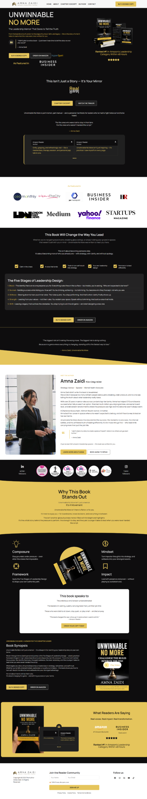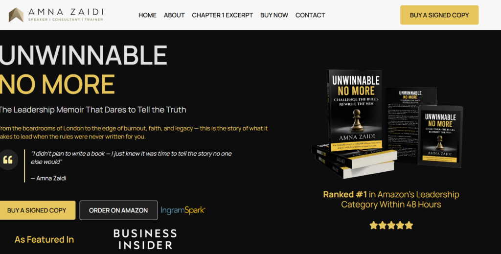 This project is a personal branding and book promotion website for author and leadership coach Amna Zaidi, created to showcase her book Unwinnable No More and establish her authority in the leadership and personal development space. The website serves as a central platform for readers, professionals, and organizations to explore her work, access book resources, and engage with her content. Techoven Solutions designed and developed a visually striking, content-rich, and conversion-focused platform that reflects professionalism, credibility, and inspirational leadership values.
