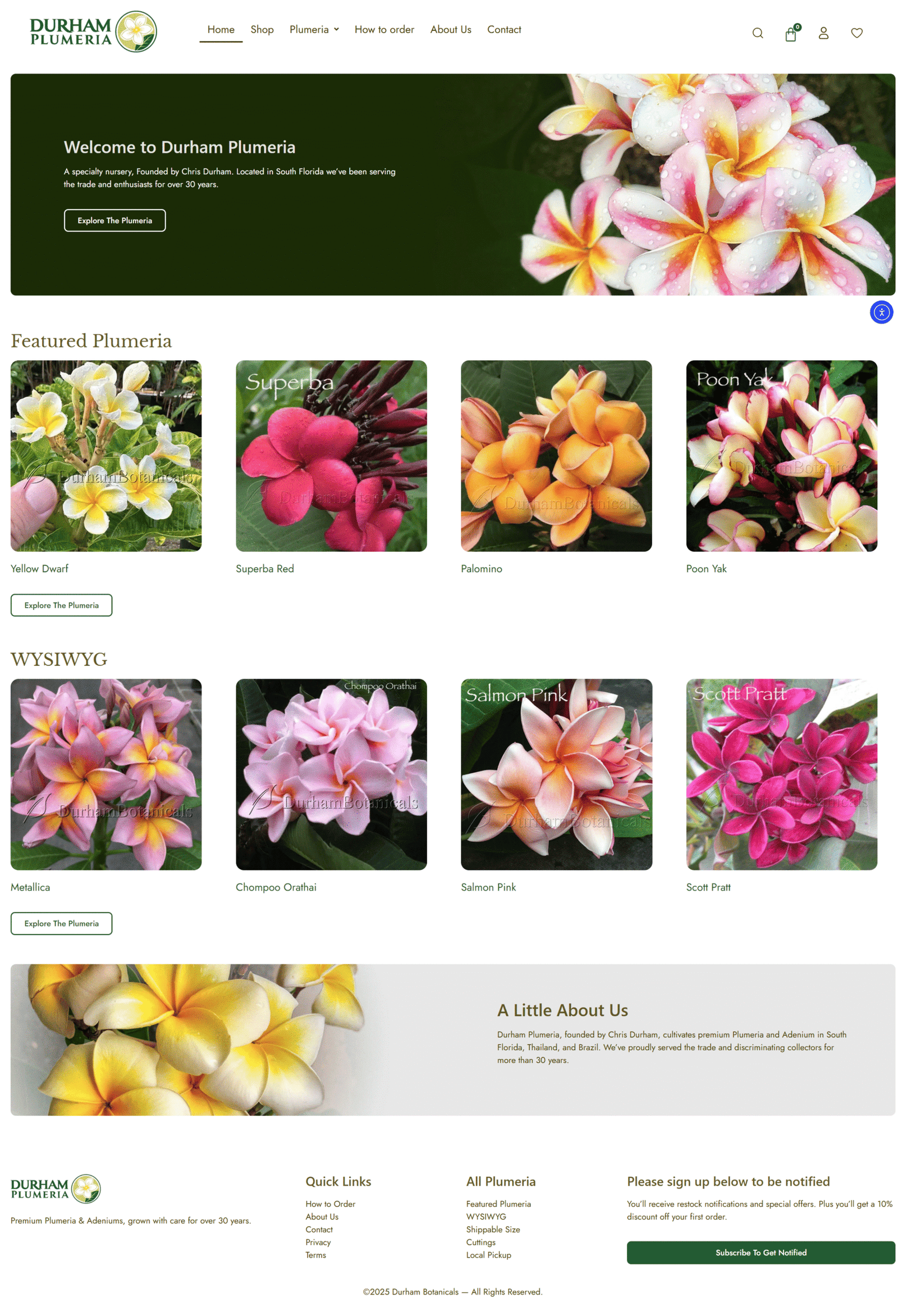 This project involved designing and developing a visually appealing and responsive website for Durham Plumeria, a business dedicated to showcasing and selling high-quality plumeria plants and related products. The site was crafted to reflect the brand’s passion for tropical gardening while offering visitors a seamless online experience across devices.