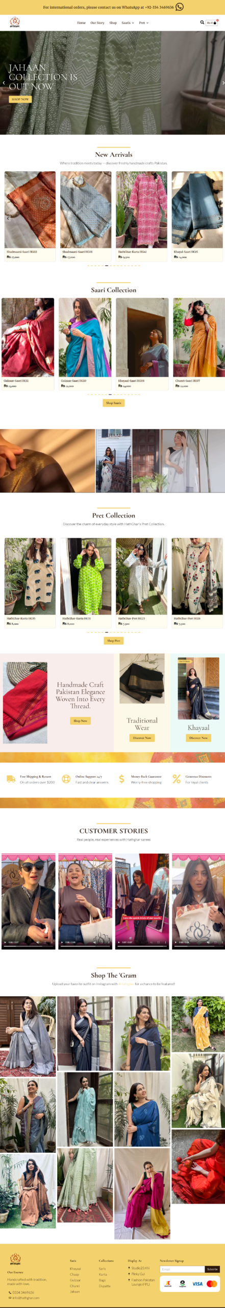 The primary goal of this project was to create a visually appealing and brand-aligned online store that reflects the elegance and authenticity of the clothing line. The website needed to present collections in an organized and engaging manner while maintaining a seamless shopping experience. Another key objective was to integrate a secure and user-friendly eCommerce system that supports product browsing, filtering, cart management, and smooth checkout. We also focused on optimizing performance, ensuring mobile responsiveness, and strengthening brand credibility through customer stories, curated sections, and social proof integration.