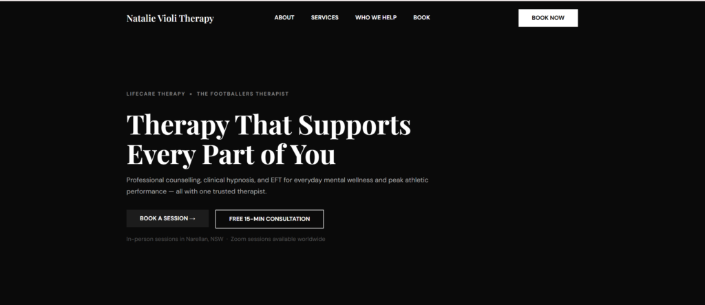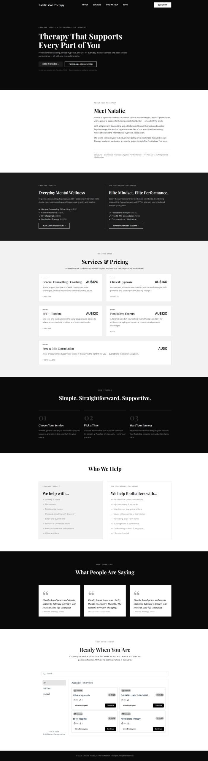 The completed website provides Natalie Violi Therapy with a strong and professional digital presence. The clean design and structured layout make it easy for visitors to understand the services offered and book sessions with confidence. Clients can now explore therapy options, learn about the practitioner, and schedule appointments through a smooth and intuitive process. The website also helps build trust by clearly presenting qualifications, services, and client feedback. Overall, the project delivered a reliable and scalable platform that supports the growth of the therapy practice while providing a supportive and welcoming online experience for individuals seeking mental health support.