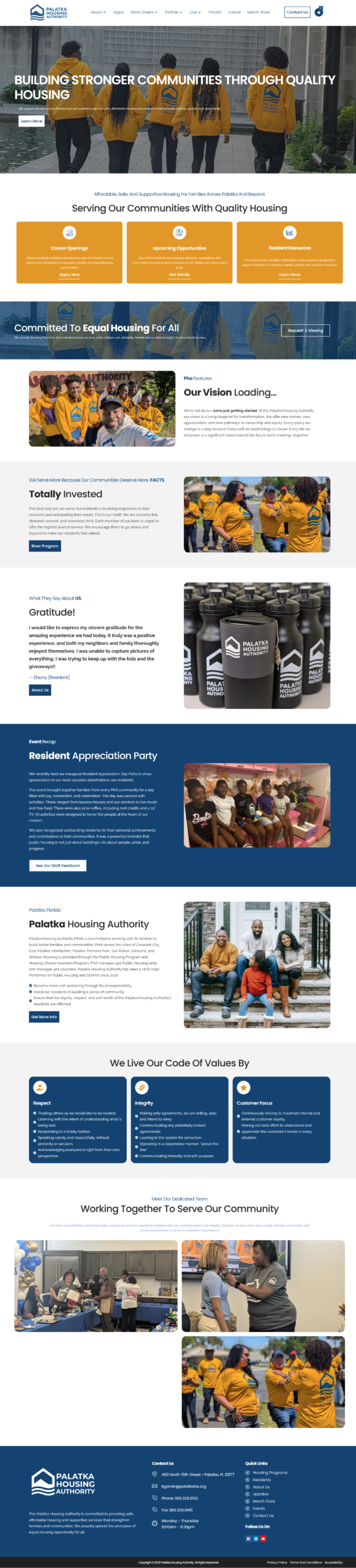 The completed website provides Palatka Housing Authority with a strong digital presence that reflects its commitment to supporting families and strengthening communities. Visitors can now easily explore available programs, access resident resources, and learn about community initiatives. The improved structure and clear messaging make the website more informative and user-friendly, helping residents find the support they need more quickly. Overall, the project delivered a modern, scalable platform that improves communication with the community while reinforcing the organization’s mission of providing safe, affordable housing and empowering residents to build stable futures.